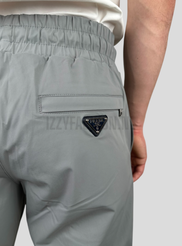 De licht grijze Prada pantalon biedt een stijlvolle mix van innovatie en elegantie. Perfect voor elke nette outfit.